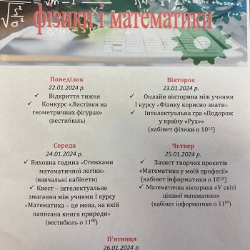 З метою створення умов для підвищення пізнавального інтересу до точних наук, пропагування досягнень математичної, фізичної науки, стимулювання творчої активності здобувачів освіти ДНЗ «Тернопільський ЦПТО» з 22 по 26 січня 2024 року проходитиме Предметний тиждень математики та фізики. Запрошуємо здобувачів освіти та працівників Центру поринути у дивовижні світи математики та фізики!